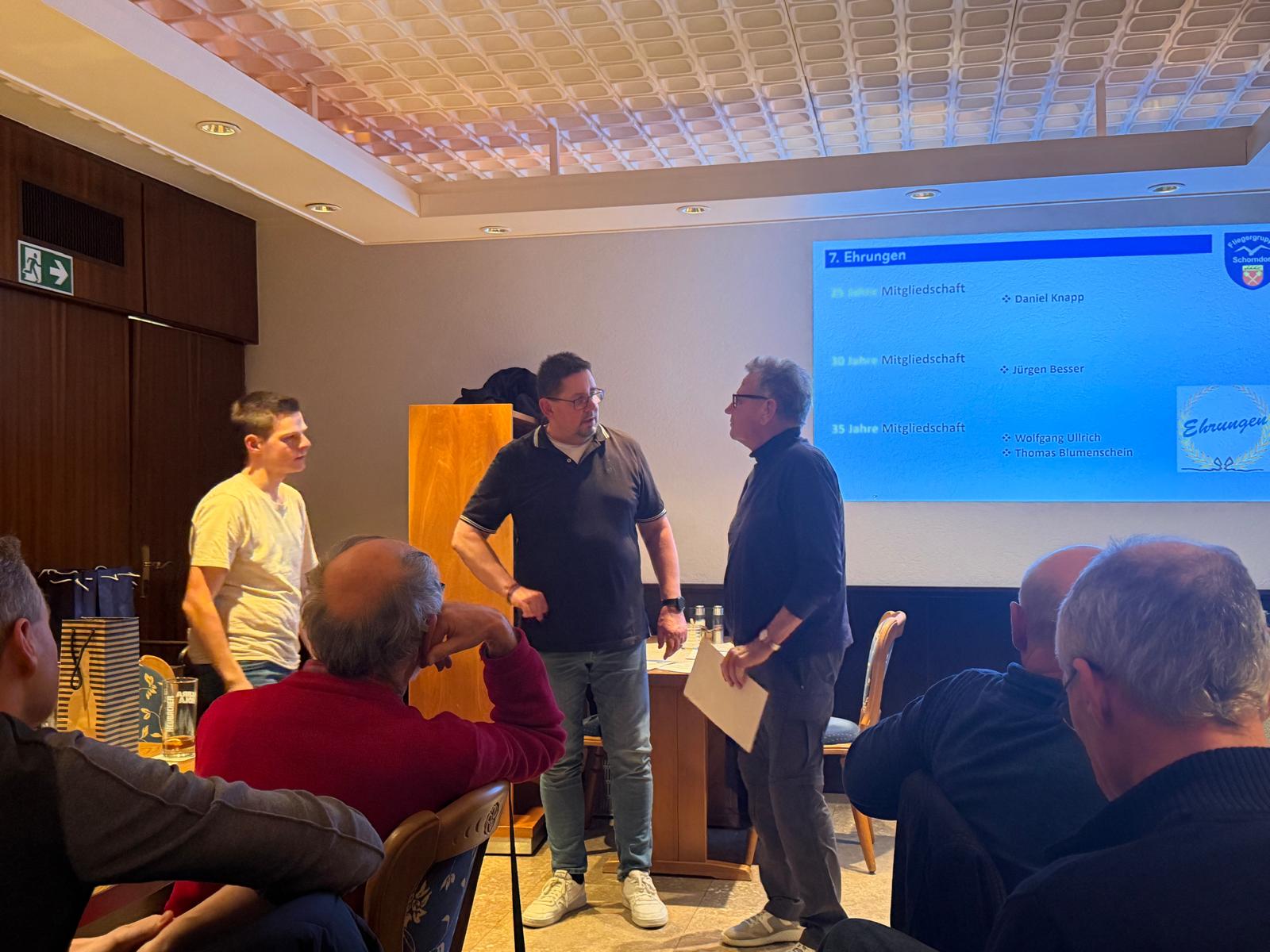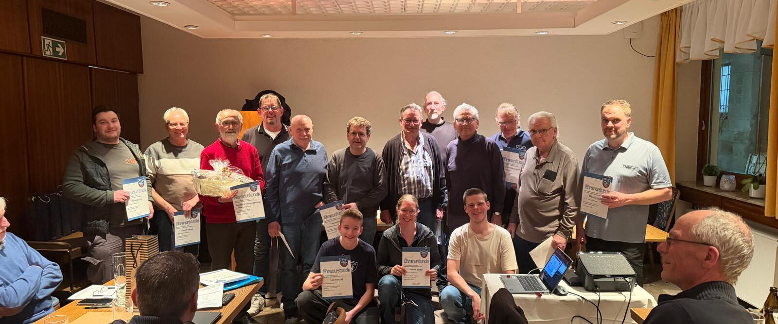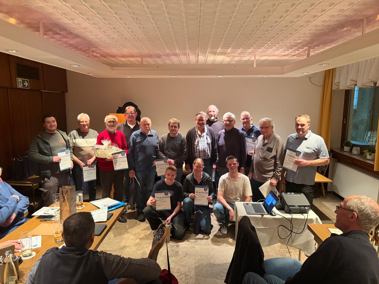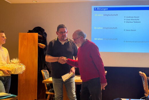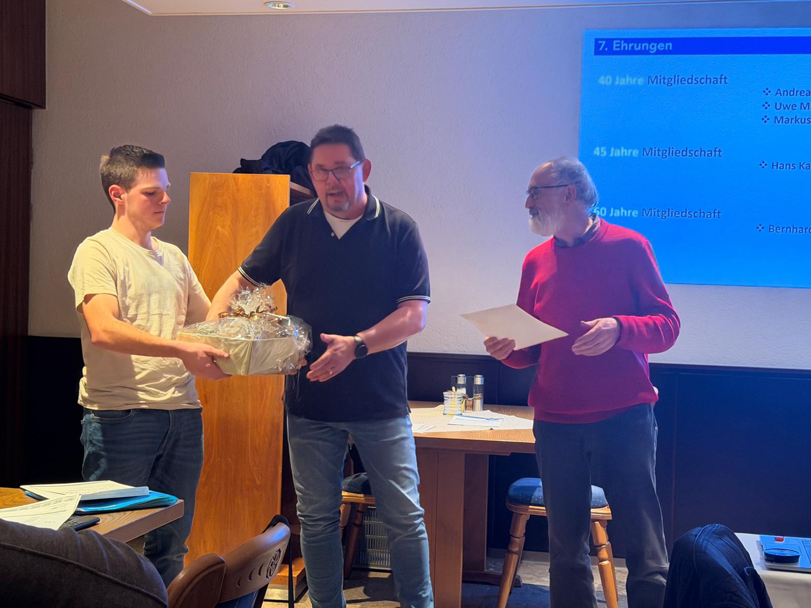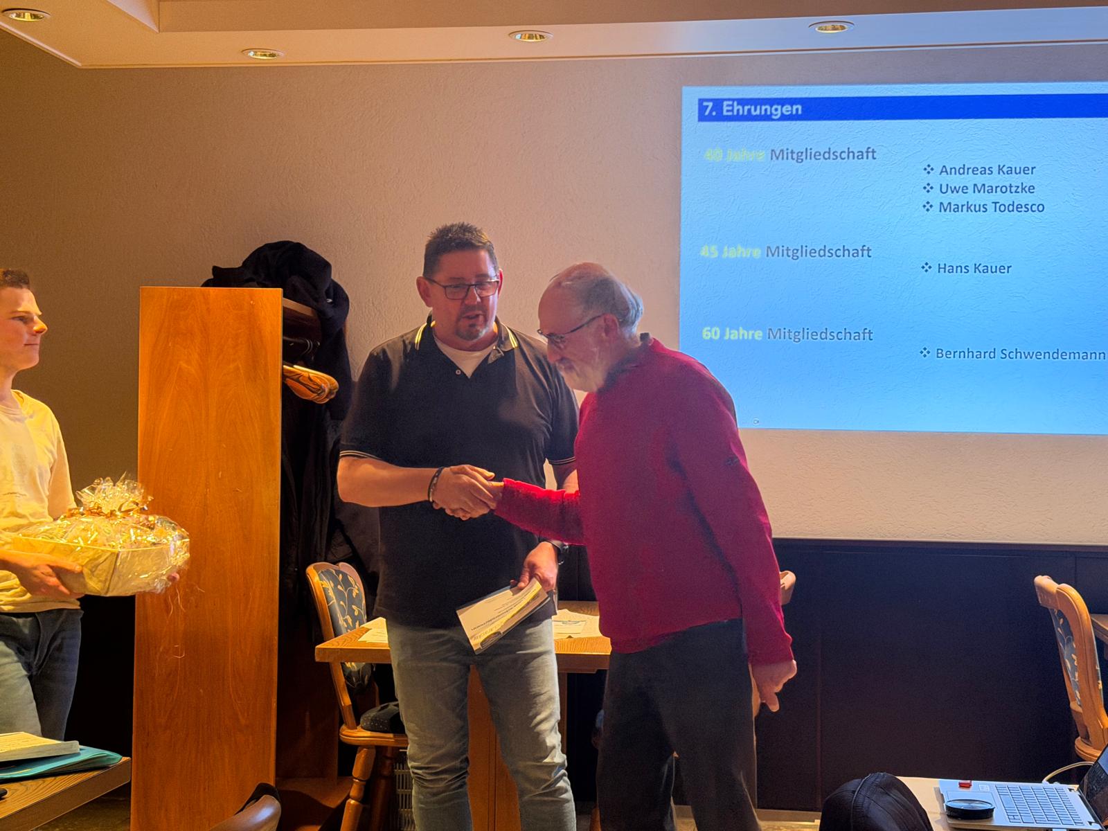 Besonders hervorzuheben ist die 60-jährige Mitgliedschaft von Bernhard Schwendemann. Über sechs Jahrzehnte hinweg hat er unseren Verein treu begleitet und aktiv mitgestaltet – eine außergewöhnliche Leistung, die mit einer Ehrenurkunde und einem Präsentkorb gewürdigt wurde.